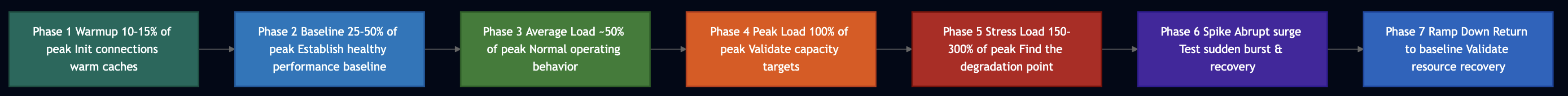 Load testing applies a realistic, expected workload and verifies the system meets defined performance targets. The workload mirrors production traffic such as request distribution, concurrency level, and payload shapes. The goal isn’t to break anything. It’s to confirm the system handles its designed workload within acceptable response times and error rates. Any change that could affect throughput like a code change in a hot path, a dependency upgrade, a configuration change, a schema migration should warrant a load test.