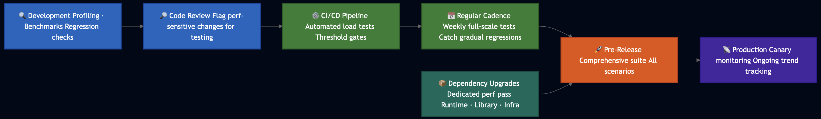 After significant dependency upgrades: Runtime upgrades, major library version bumps, and infrastructure changes all deserve their own performance test pass.