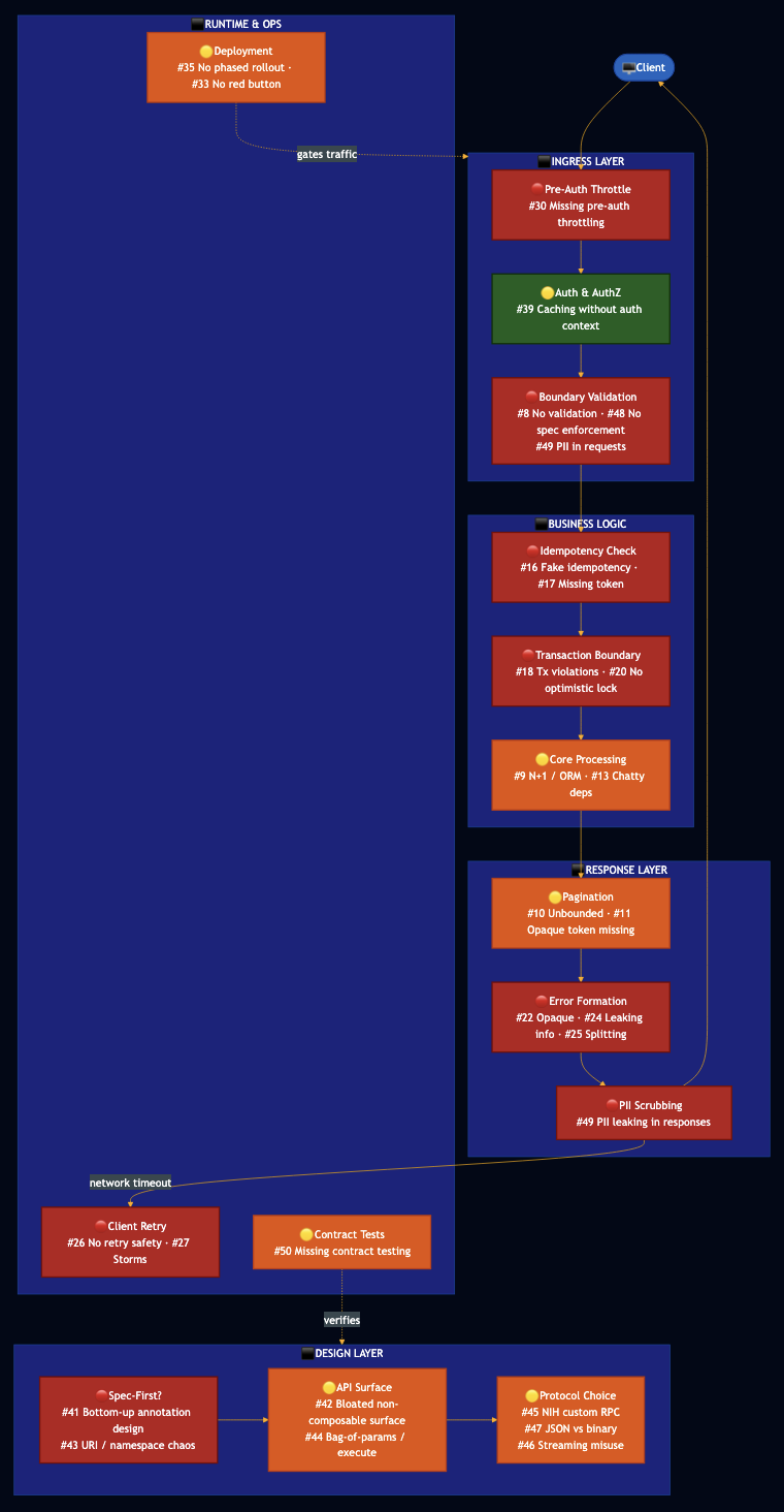 Over the past years I have written extensively about what makes distributed APIs fail. In How Abstraction Is Killing Software I showed how each layer crossing a network boundary multiplies latency and failure probability. In Transaction Boundaries: The Foundation of Reliable Systems and How Duplicate Detection Became the Dangerous Impostor of True Idempotency, I showed how subtle contract violations produce data corruption. Building Robust Error Handling with gRPC and REST, Zero-Downtime Services with Lifecycle Management, and Robust Retry Strategies for Building Resilient Distributed Systems explained error handling and operational health. My production checklist and fault tolerance deep-dive outlined those lessons actionable before a deployment. I also built an open-source API mock and contract testing framework, available at github.com/bhatti/api-mock-service that addresses how few teams verify their API contracts before clients discover the gaps in production. And in Agentic AI for Automated PII Detection I showed how AI-driven scanning can find the sensitive data leaking through APIs that manual review misses. Here, I am showing 50 anti-patterns across seven categories, each with a real-world example. Two laws sit at the foundation of everything that follows.