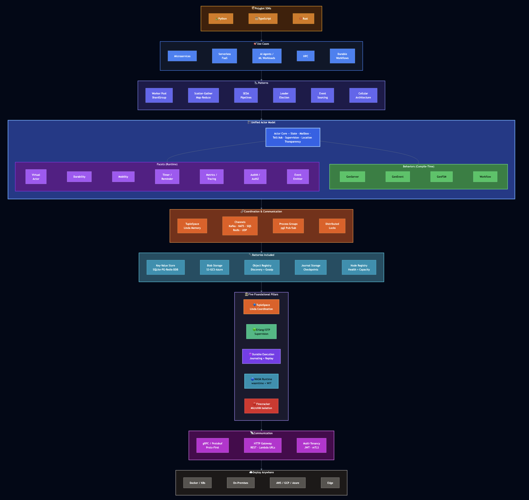 - Polyglot via WASM: Write actors in Python, Rust, TypeScript. Same deployment model.