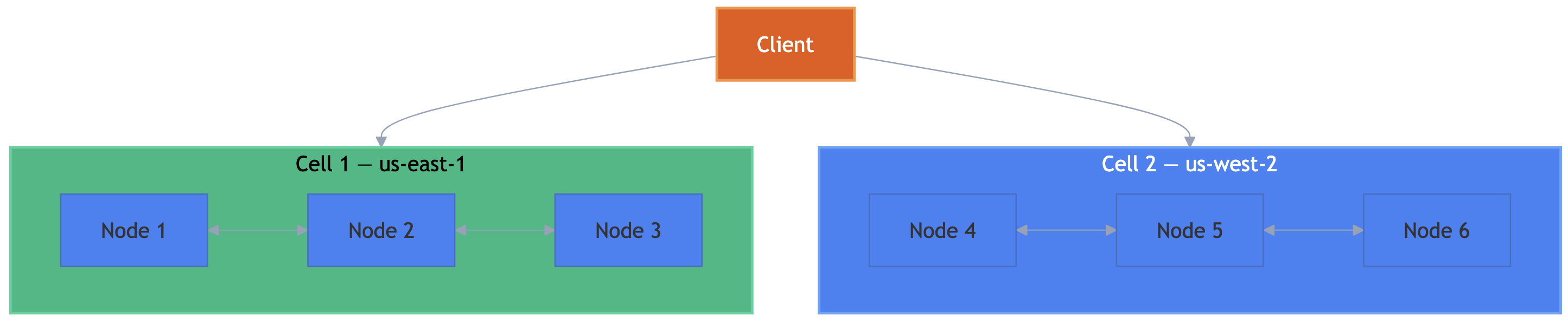 PlexSpaces organizes nodes into cells using the SWIM protocol (gossip-based node discovery). Cells provide fault isolation, geographic distribution, and low-latency routing to the nearest cell. Nodes within a cell share channels via the cluster_name configuration, enabling UDP multicast for low-latency cluster-wide messaging.