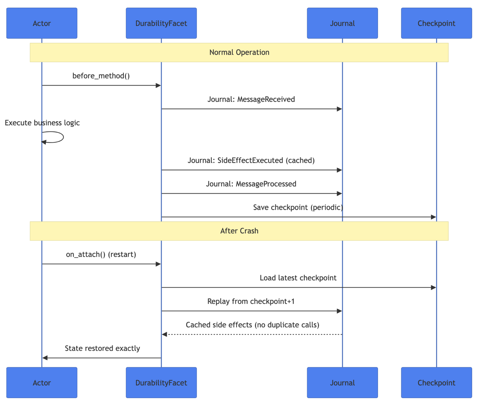 - Durable Execution: Every actor operation gets journaled. When a node crashes, the framework replays the journal and restores state exactly. Side effects get cached during replay, so external calls don’t fire twice. Inspired by Restate and my earlier work on formicary.
