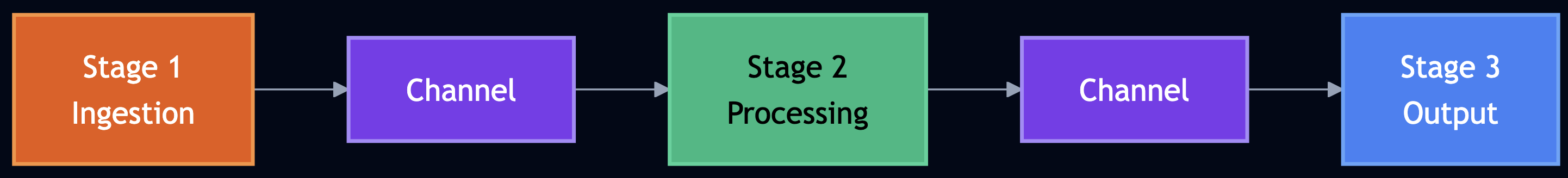 Chain processing stages through channels. Each stage runs at its own pace, and channels provide natural backpressure: